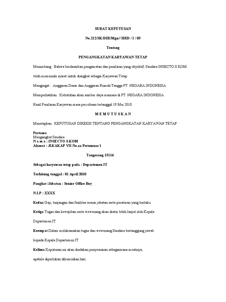 Ada banyak contoh surat keputusan yang digunakan banyak perusahaan, lembaga pendidikan dan kepegawaian. Bersama surat ini disampaikan dengan sangat hormat kepada saudara botanica putri bahwasanya berdasarkan evaluasi dan penilaian produktivitas kerja, perusahaan memutuskan mengangkat saudara menjadi karyawan tetap di pt. Nhah untuk lebih memahaminya, berikut contoh surat keputusan pengangkatan karyawan tetap contoh surat keputusan. The collection that consisting of chosen picture and the best among others. Nah, contoh surat keputusan juga bisa anda terapkan untuk kegiatan sebagai berikut: